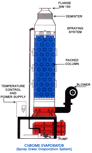 The chromic acid recovered from the chrome recovery system has to be of a certain concentration before it can be added into the main plating tank. For this, a chrome evaporator is used as it is most energy efficient. It operates using the principle of evaporation where the hot solution is sprayed from the top of the column and drops down through a packed column in the reservoir tank. Air is blown from the bottom & a chamber gets saturated with water vapour. A demister is provided to separate any droplets from the air.
